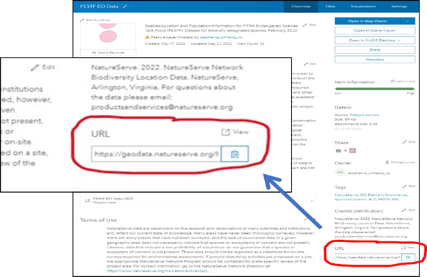 This can be found on the NatureServe Geodata Portal item page for the service under “URL” (Figure 6b).