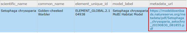 Figure 16 - In the attribute table, find the model of interest. Then, scroll to the right to find the“metadata_url” field. Click on the link that corresponds to the model summary PDF. (Figure 17)