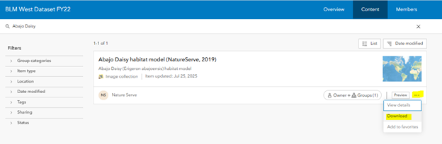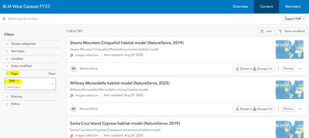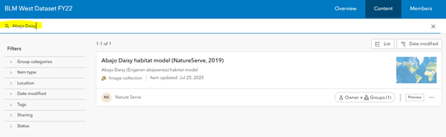 - Once your account has access to the occurrence data and Habitat Models, you can navigate to the Group Content on the NatureServe Geodata Portal to see all the content.