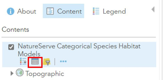 - Locate the AGOL data layers containing species habitat models, select the NatureServe Categorical Species Habitat Models layer and open it in map viewer. (Figure 15)