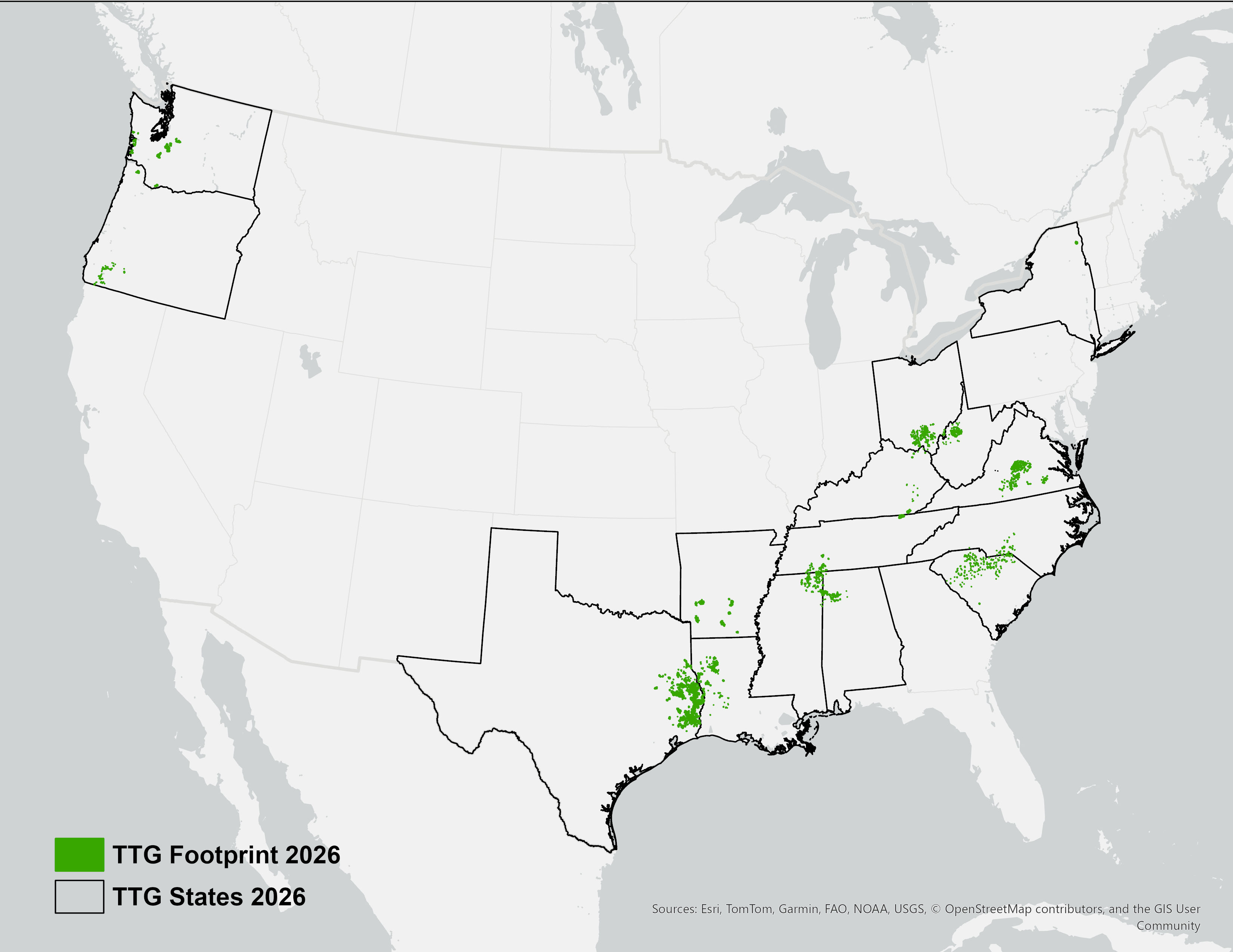 Data will be limited to a footprint (shown below as TTG Tracts) provided by TTG Forestry that includes data from portions of the following states: AL, AR, KY, LA, MS, NC, NY, OH, OR, SC, TN, TV, TX, VA, WA, and WV.