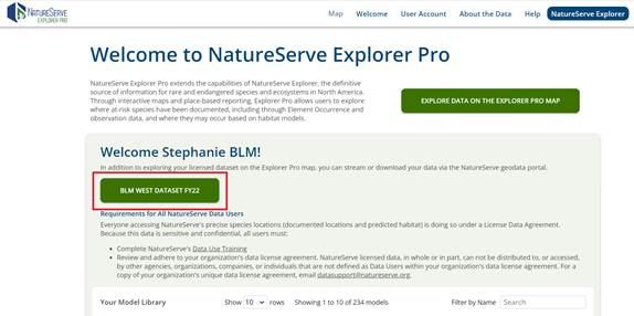 There are two ways to access licensed datasets through the geodata portal. The simplest way to access the licensed data once your account has been provided access is through the NatureServe Explorer Pro Welcome Page. You will see a link to the datasets below your login name (Figure 1).